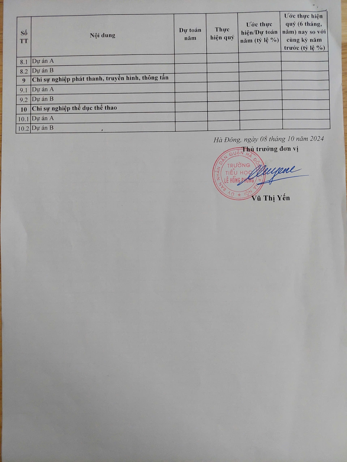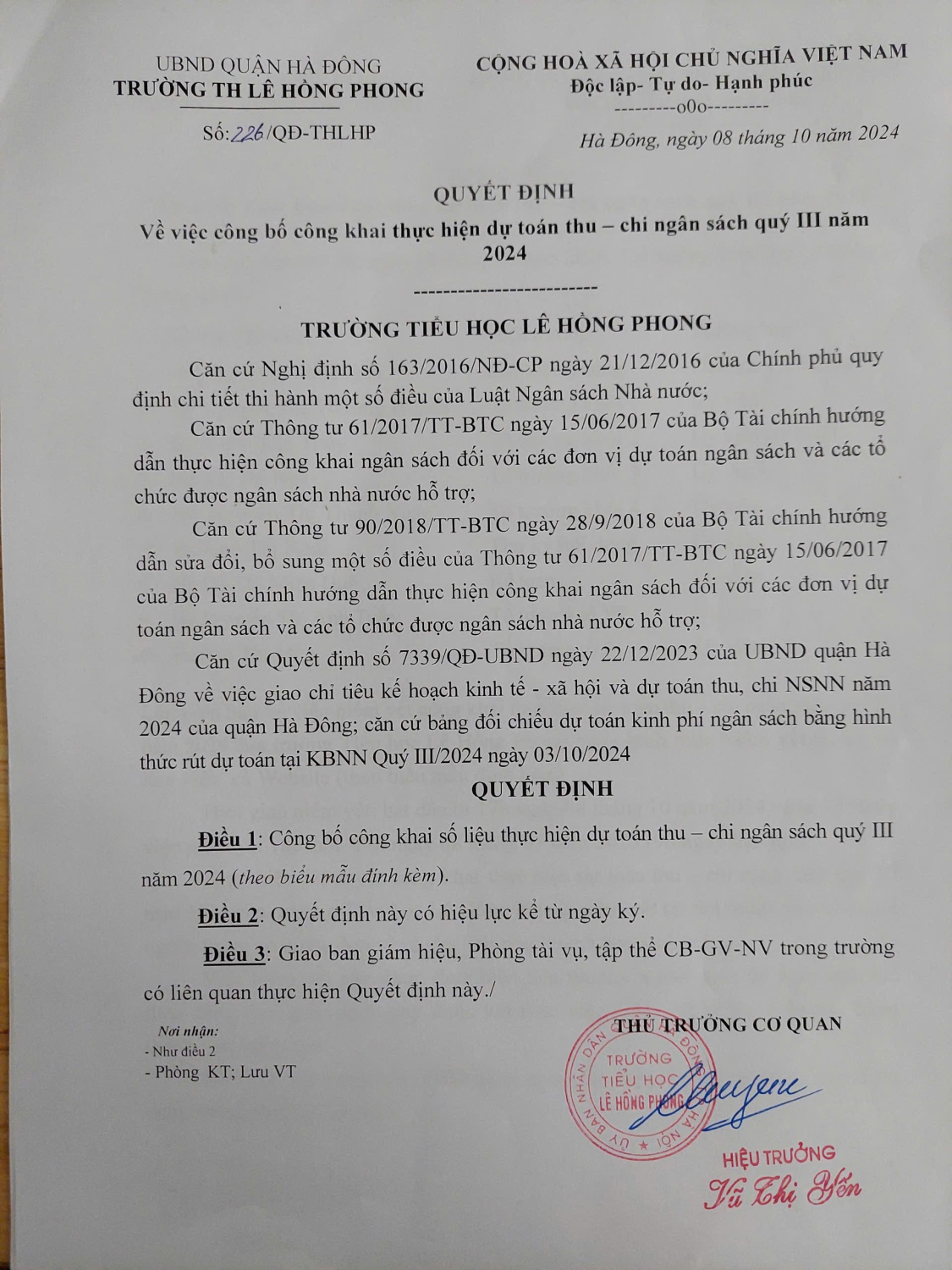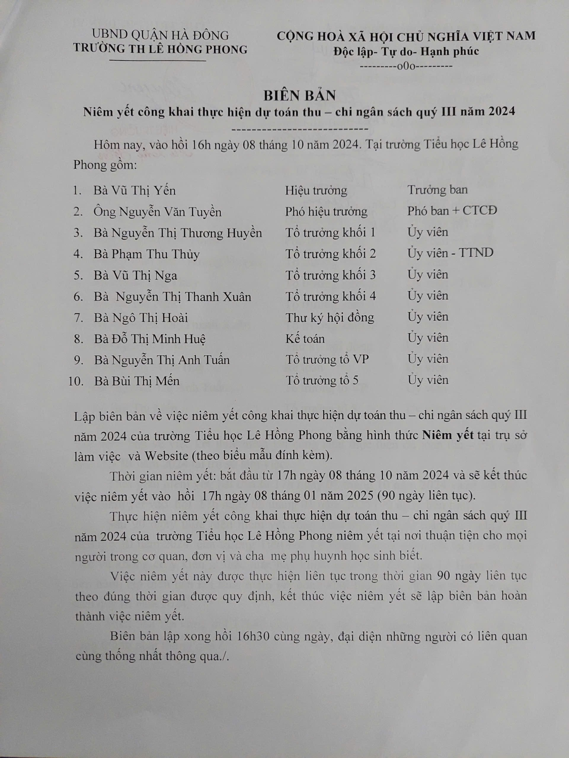 Trường Tiểu học Lê Hồng Phong công khai thực hiện dự toán thu - chi ngân sách quý 3 năm 2024.