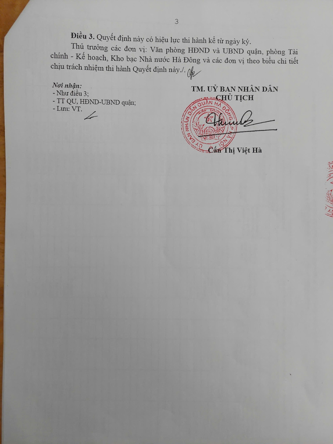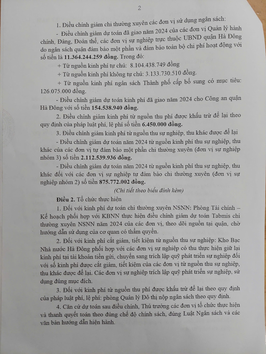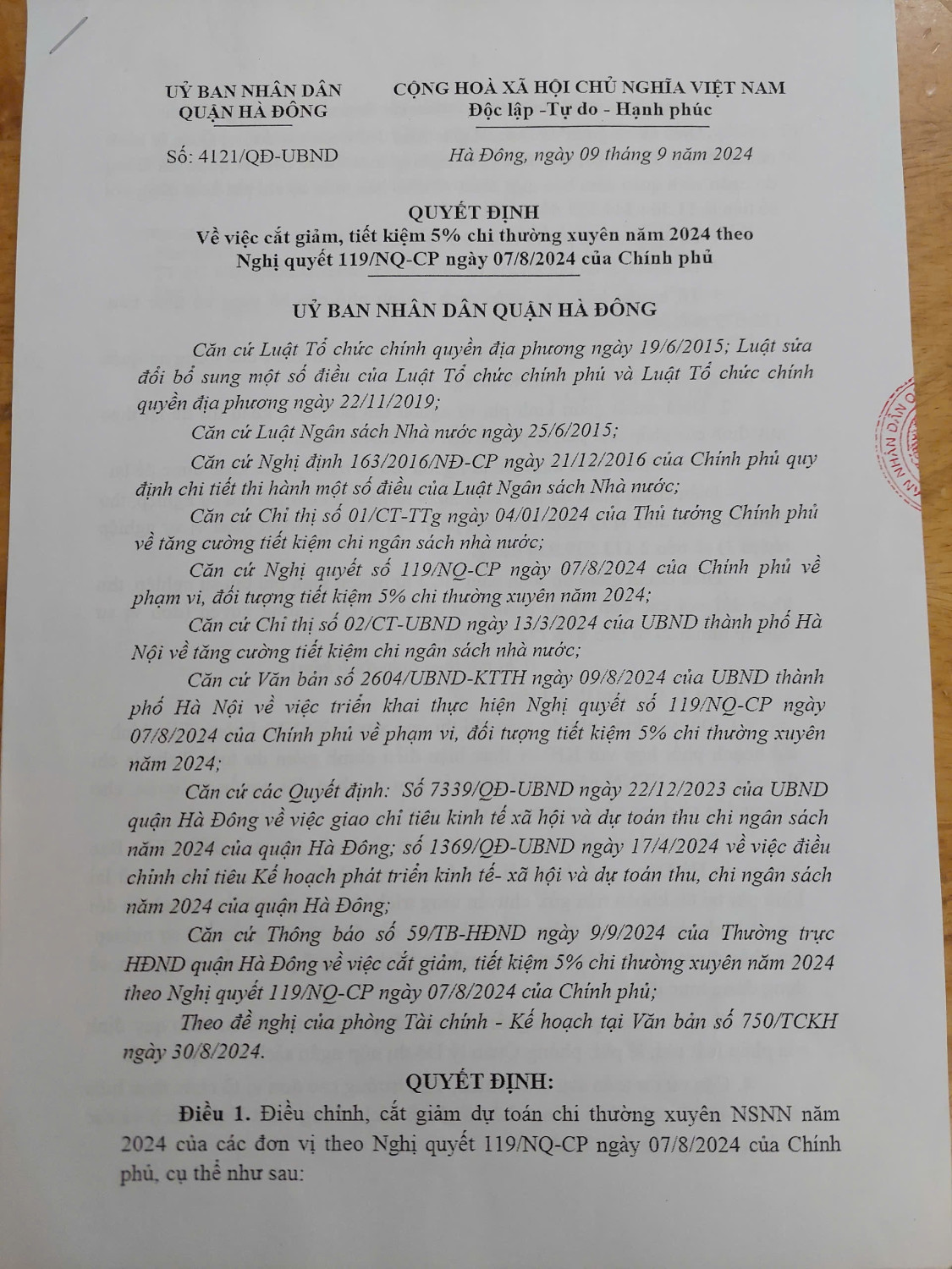 Ngày 09/9/2024, UBND quận Hà Đông ban hành Quyết định số 4121/QĐ-UBND V/v cắt giảm ngân sách tiết kiệm 5% kinh phí thường xuyên năm 2024 theo Nghị quyết 119/NQ-CP ngày 07/8/2024 của Chính phủ.